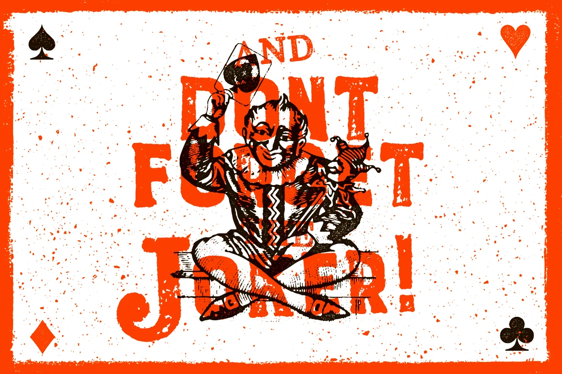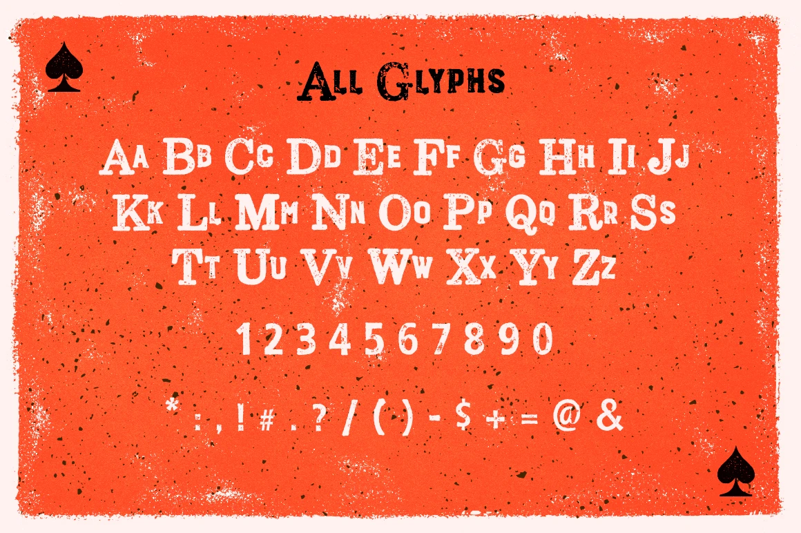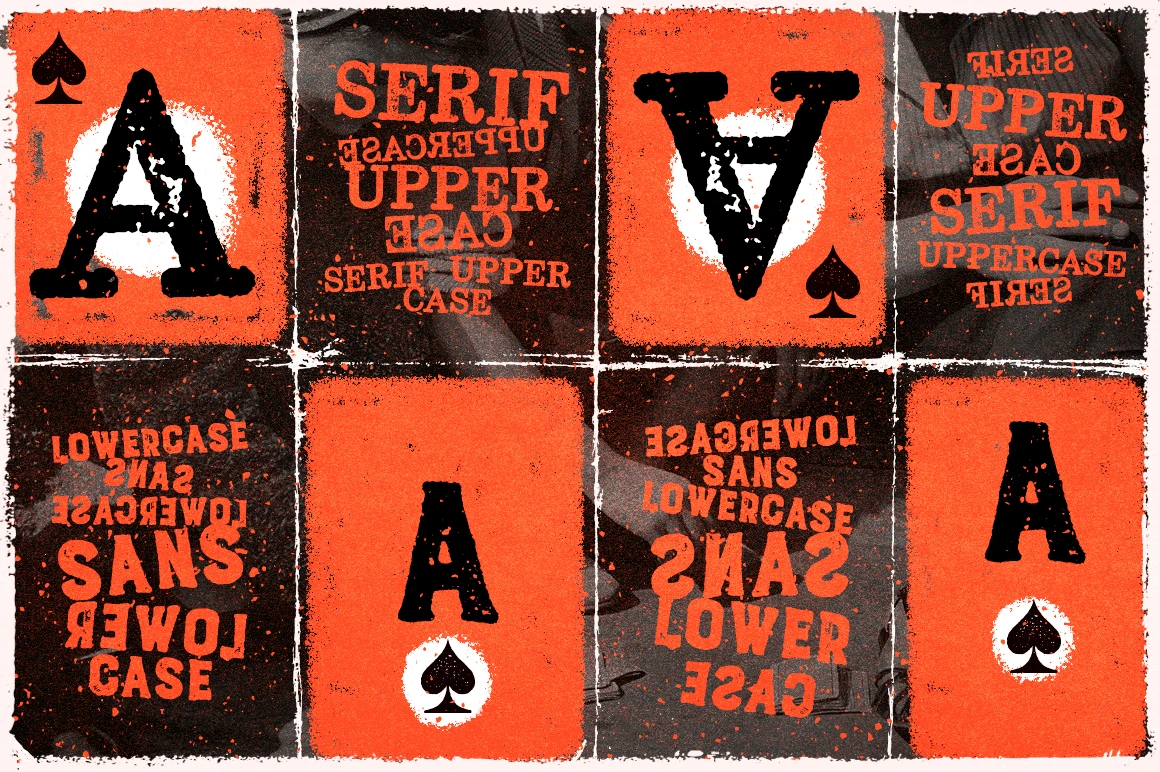 Ace of Spades is a combo font with serif uppercase and sans-serif lowercase letters. Built using a real letterpress process for true vintage texture. Perfect for t-shirts, packaging, posters, and bold photo overlays. Inspired by old-school print methods and designed for eye-catching, nostalgic design. Adds charm and energy to any creative project.