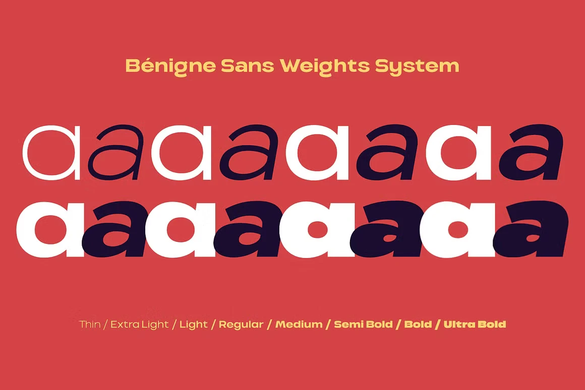 Benigne Sans is a geometric font family with eight weights from Thin to Ultra Bold, each paired with matching italics. Offers a smooth balance from delicate to bold, making it versatile for headers, sub-headers, and block text. Designed with clean, modern proportions for clarity and impact. Well-suited for infographics, editorial layouts, branding, and web use. Includes features like ligatures, alternates, old style numerals, and fractions for added flexibility. Crafted for projects that need both function and style.
