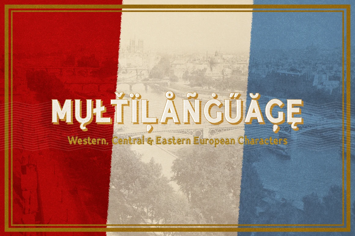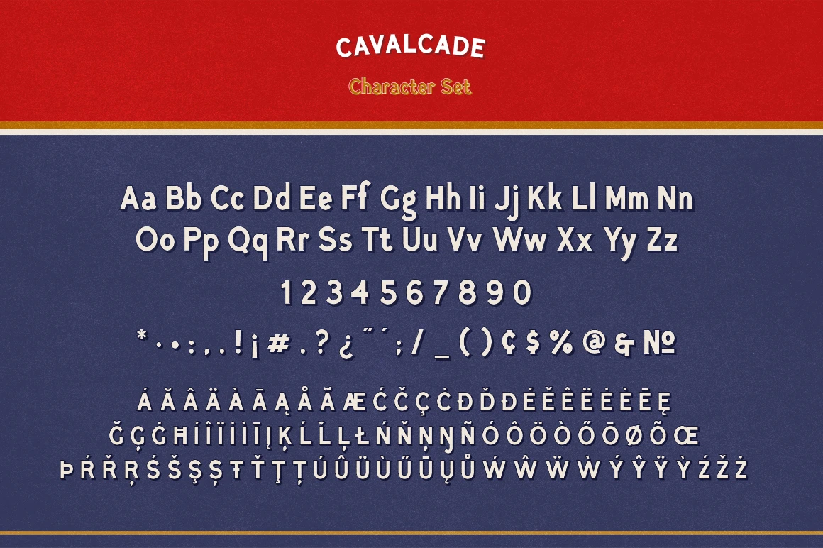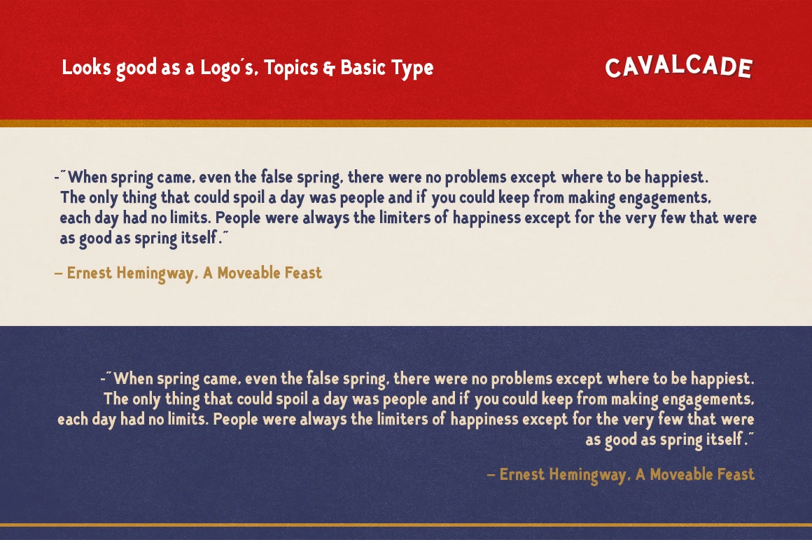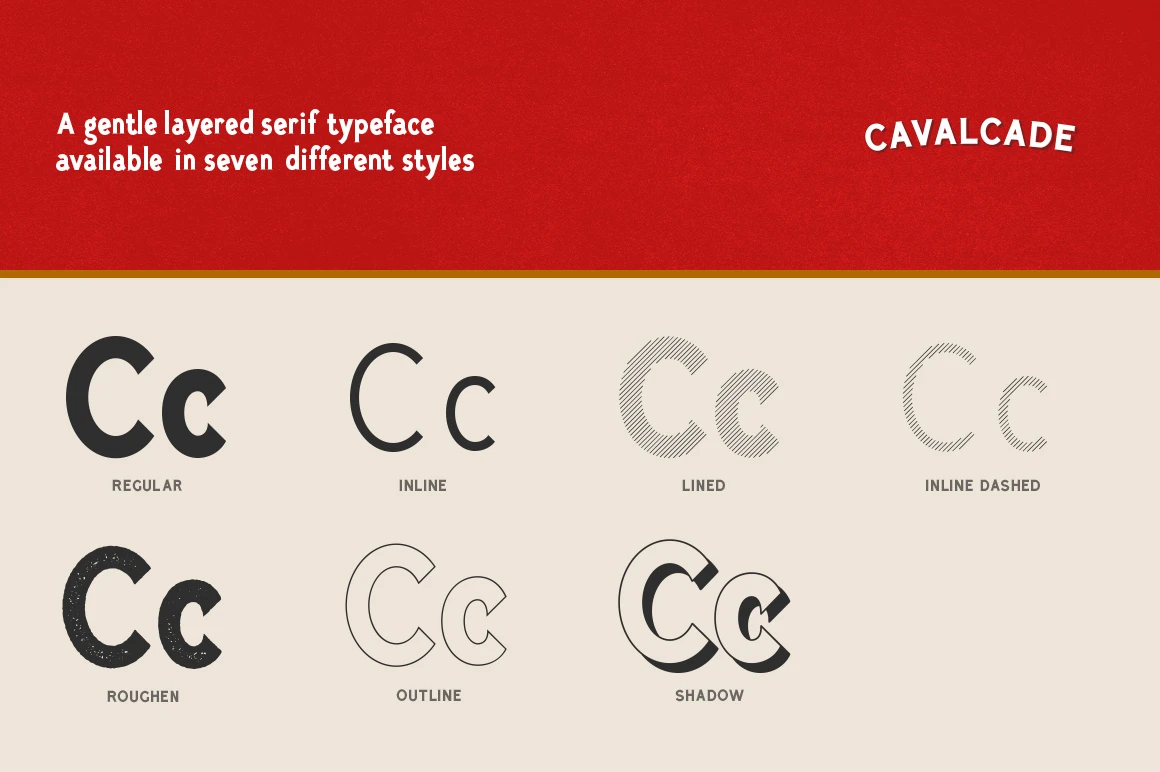 Cavalcade is a layered serif typeface inspired by early 20th-century American and European typography. Draws influence from vintage movie posters and classic alcohol labels like Martini, Cinzano, and Campari. Multiple layer combinations offer a wide range of eye-catching effects. Ideal for t-shirts, retro posters, prints, cards, mugs, and packaging design. Made for bold, nostalgic visuals with a refined vintage feel.