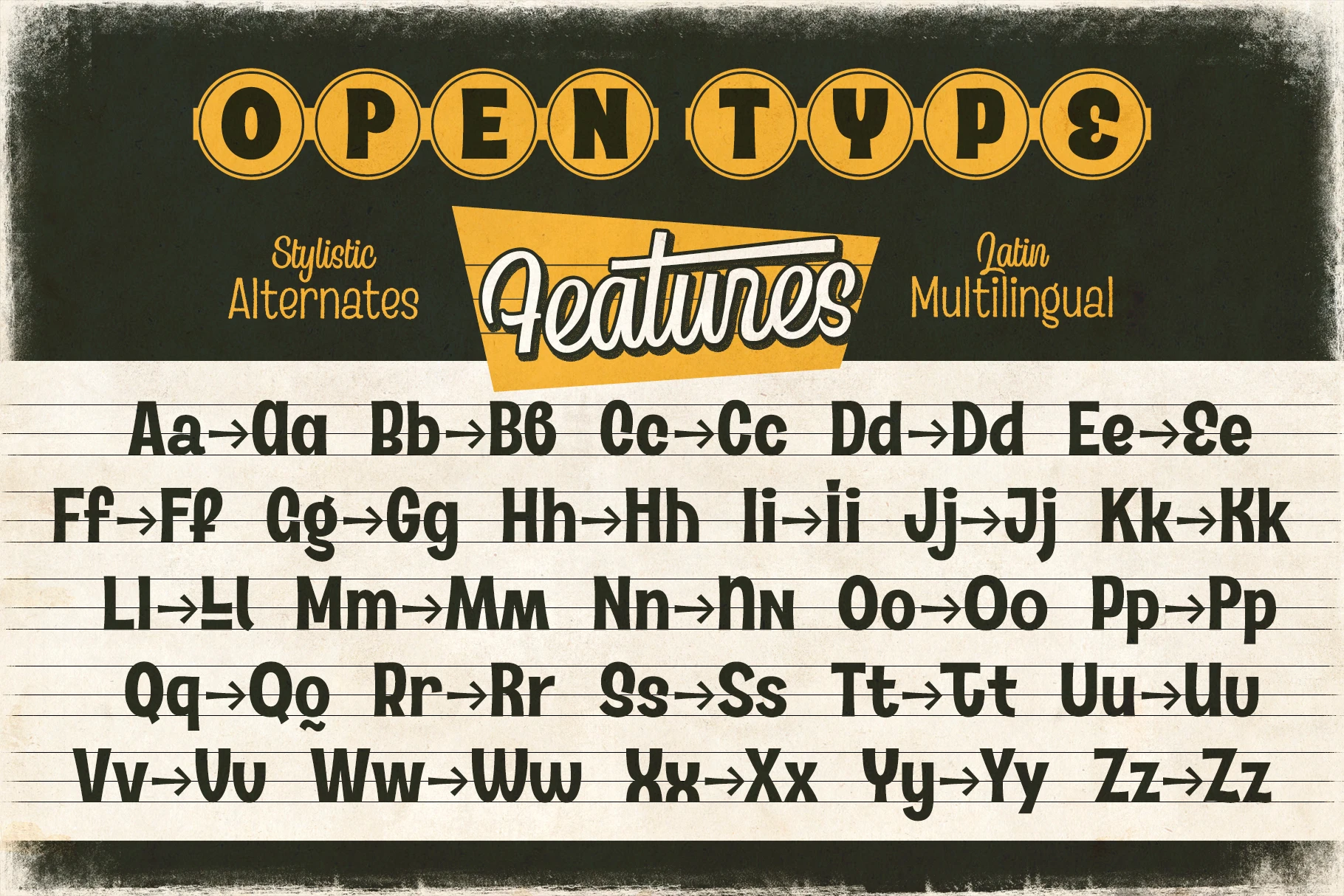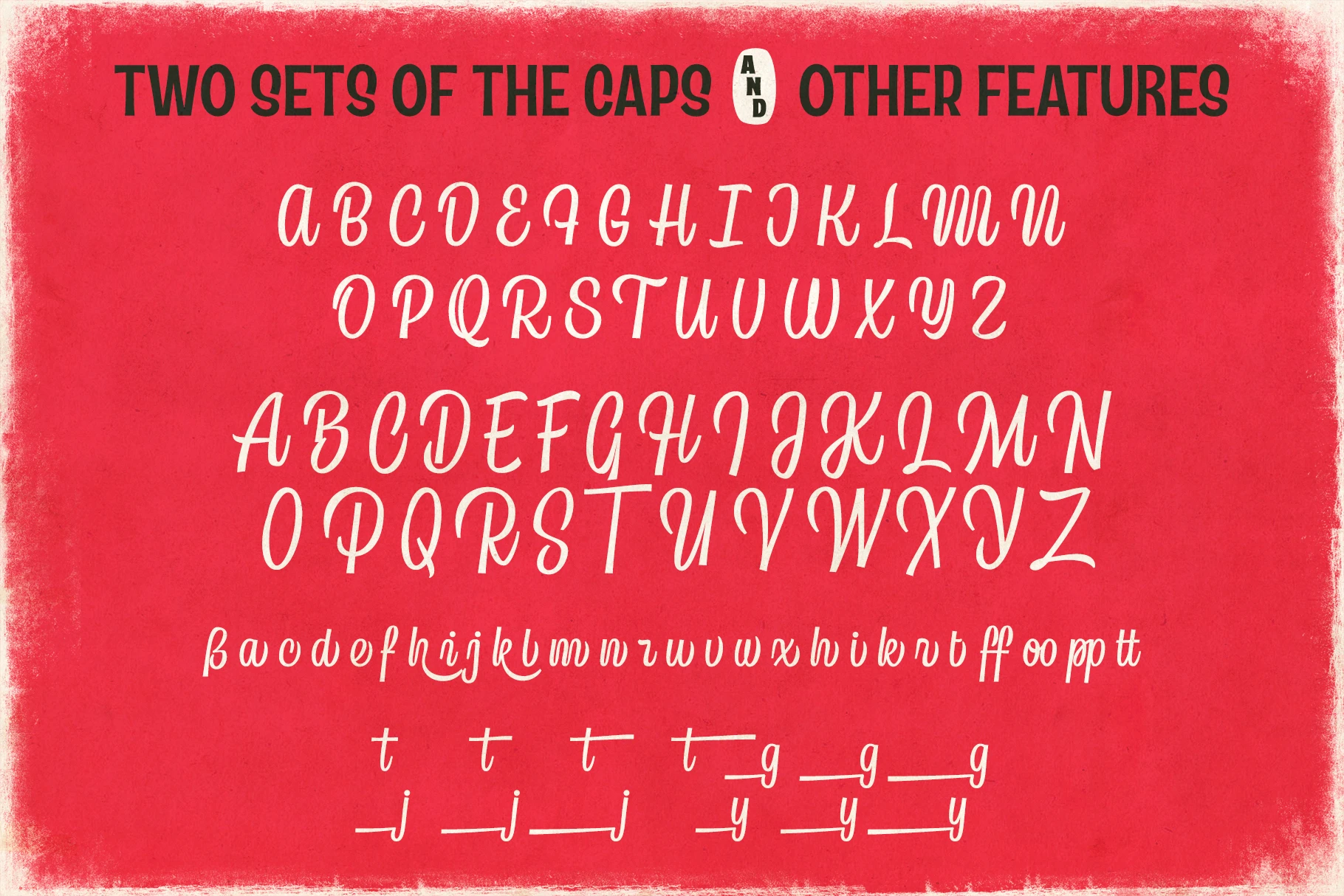 The script adds rhythm and flair with alternate capitals and unique lowercase features like underlined ‘g’, ‘j’, ‘y’, and a special long-stroke ‘t’.