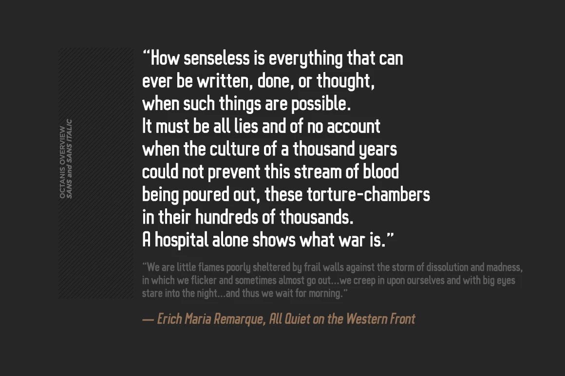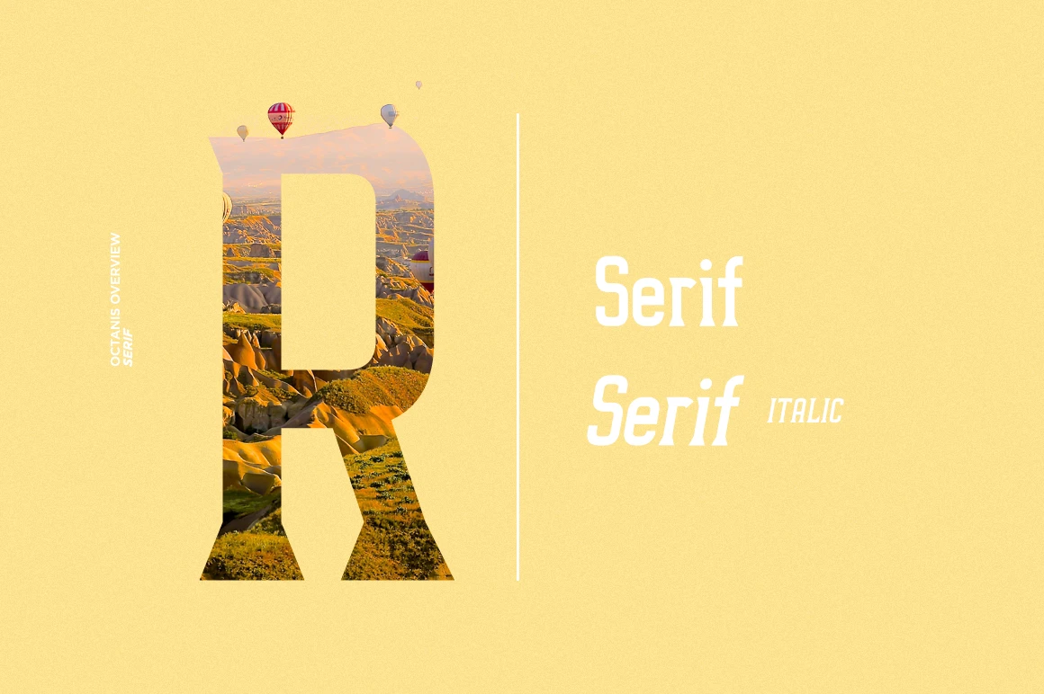 Octanis is a modern font family offering a versatile range of styles for clean, thoughtful design. The sans and sans italic bring a bold, contemporary feel, while the rounded version softens the tone with a friendlier edge. For a more classic touch, the slab styles offer a subtle vintage look, and the serif goes fully retro for a traditional feel. With its minimal, adaptable design, Octanis is well-suited for branding, editorial layouts, packaging, and digital content.