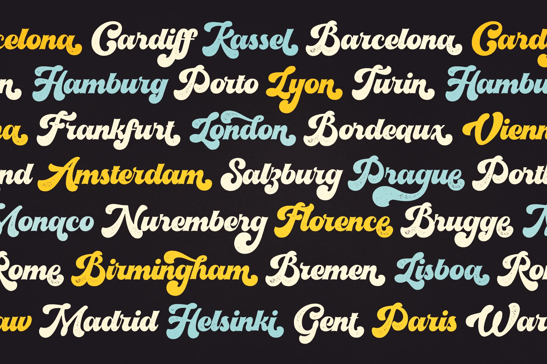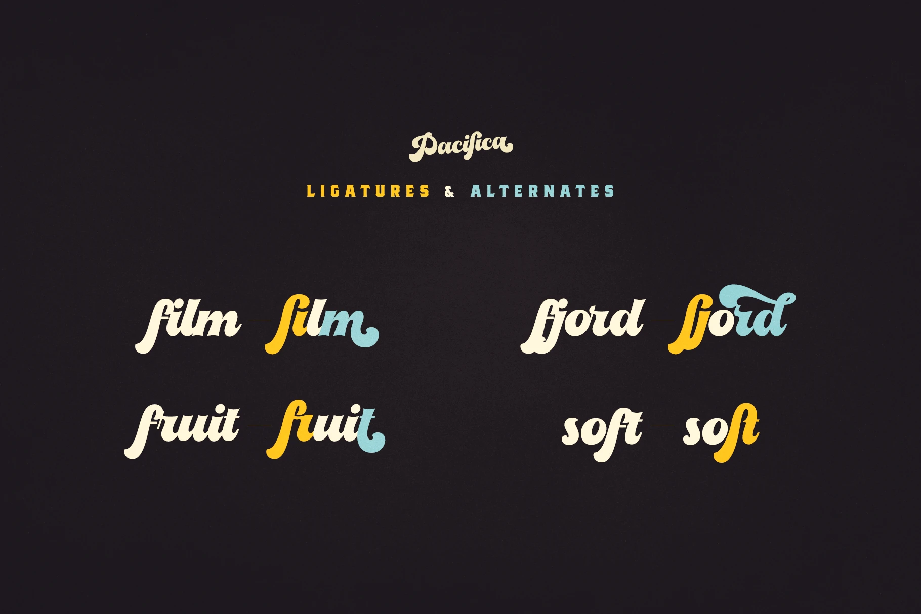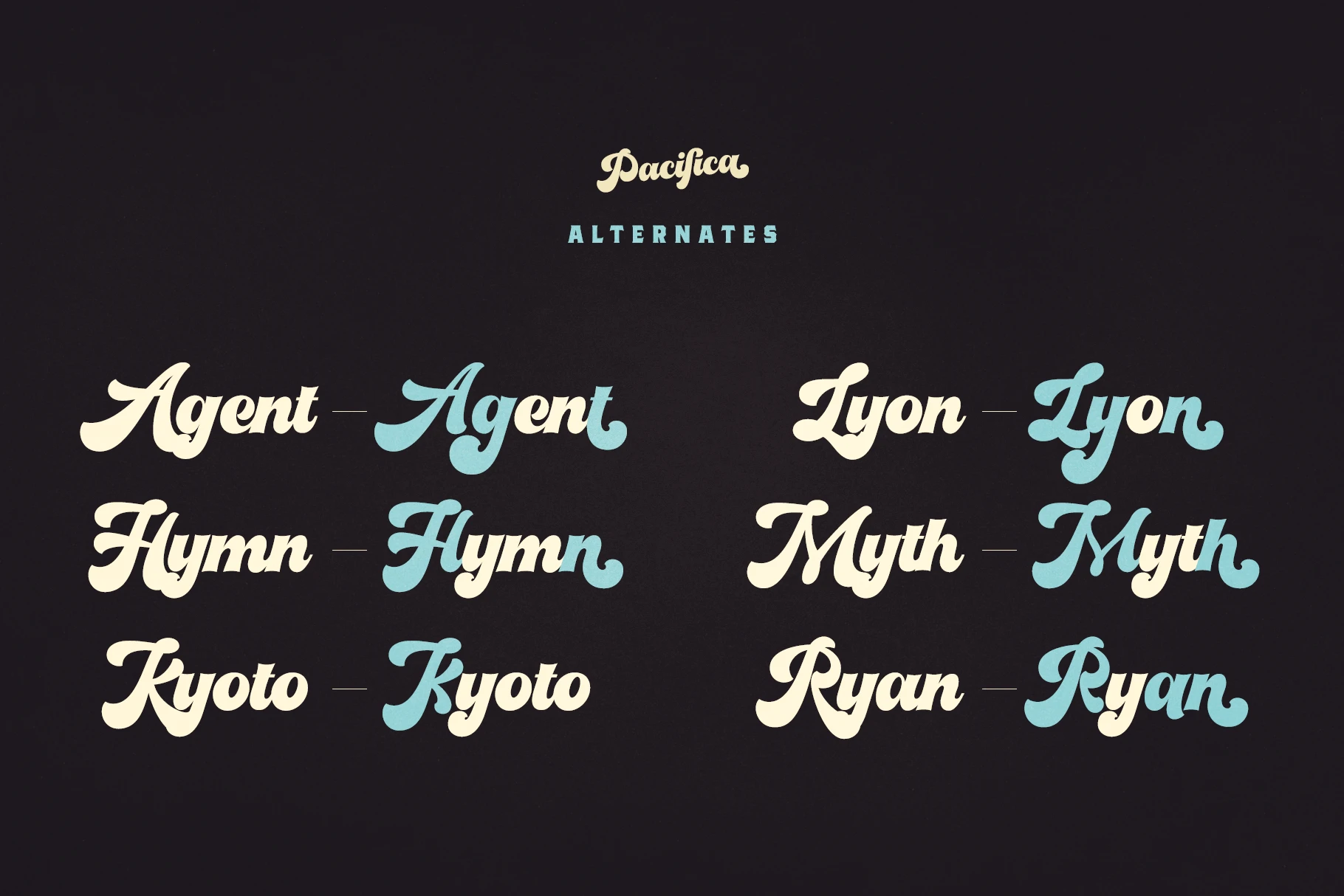 Pacifica is a hand-lettered bold script inspired by late 20th-century American branding typography. Designed for decorative use with an elegant, confident look. Available in multiple variations — filled, highlighted, and pressed — for added texture and style. Ideal for headers, signs, logos, prints, and display applications. Includes ending and middle alternates, along with standard ligatures, to create expressive and customized lettering. Built to bring a bold vintage flair to standout designs.