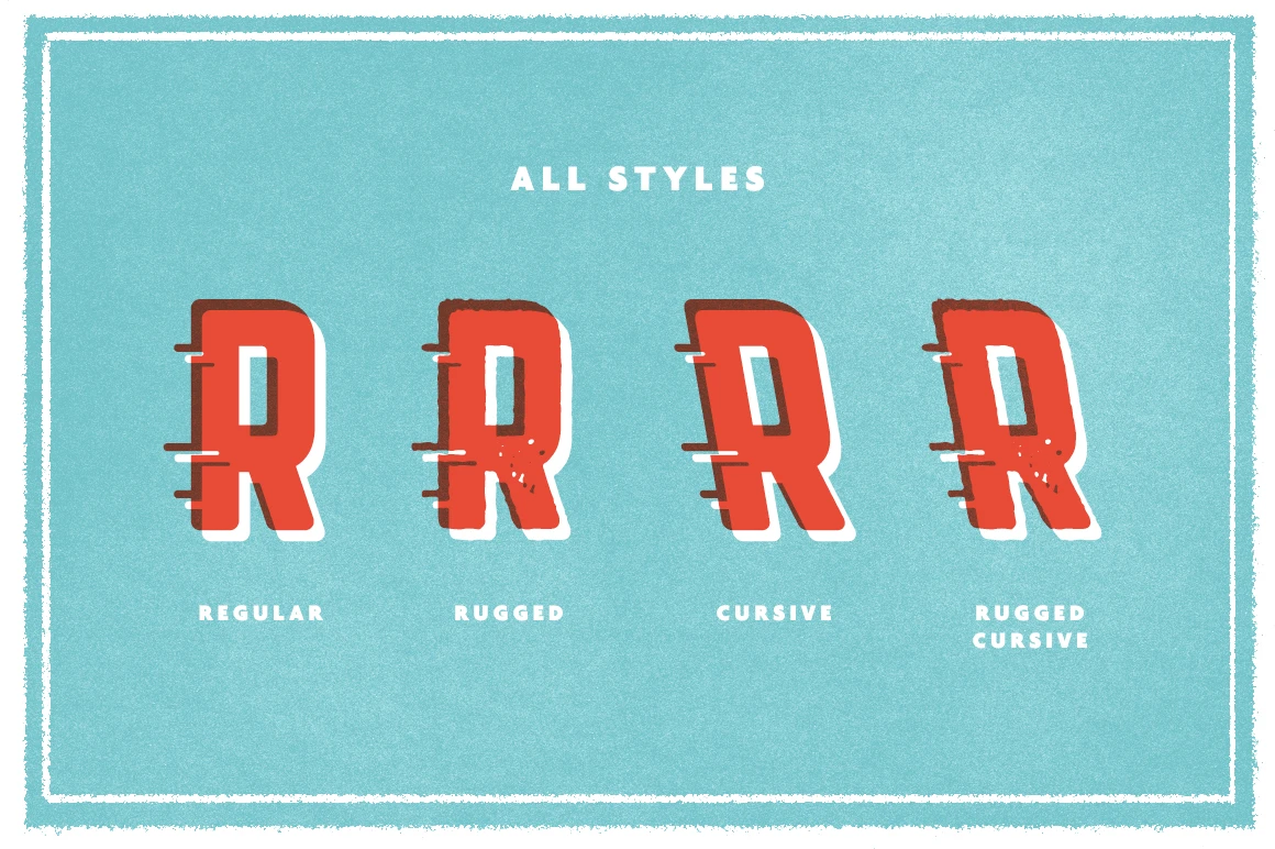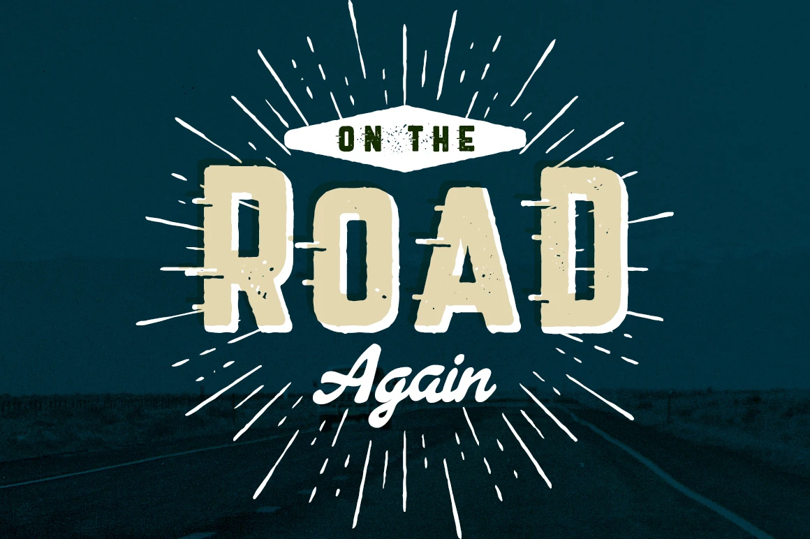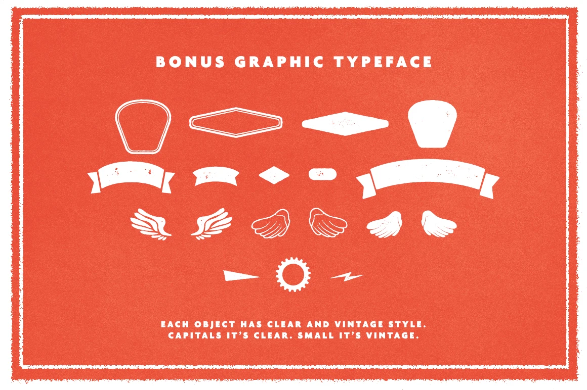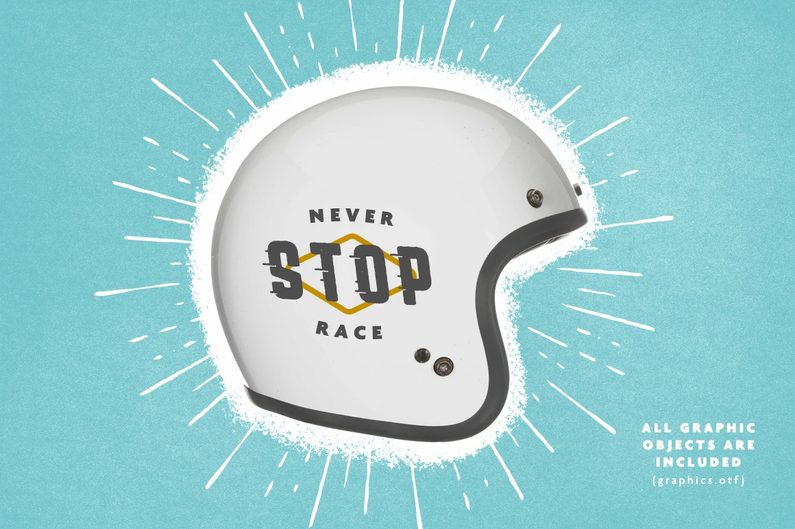 Roadstar is a fast-paced display font family inspired by classic films, vintage posters, and the bold spirit of motorcycle and race car culture. Reflects the energy of legends like Steve McQueen and Marlon Brando, and the heritage of Triumph, Indian, Harley, Chevrolet, Ford, and Plymouth. Designed for eye-catching prints, posters, mugs, and all kinds of graphic design. Includes Clear and Rough styles, with Regular and Italic options for flexible use. Comes with graphic elements to help create powerful vintage compositions. Perfect for projects fueled by speed, grit, and nostalgia.