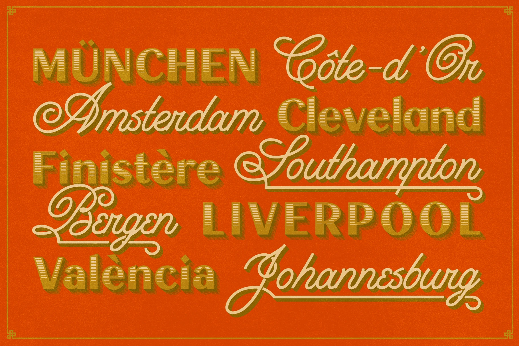 Signscape is a layered type system inspired by the ornate sign art of the Victorian era. It pairs a classic sans-serif with a moonlike script, creating a strong vintage aesthetic. Designed for flexibility, the layered structure allows for easy customization and depth, offering multiple variations for any inscription.