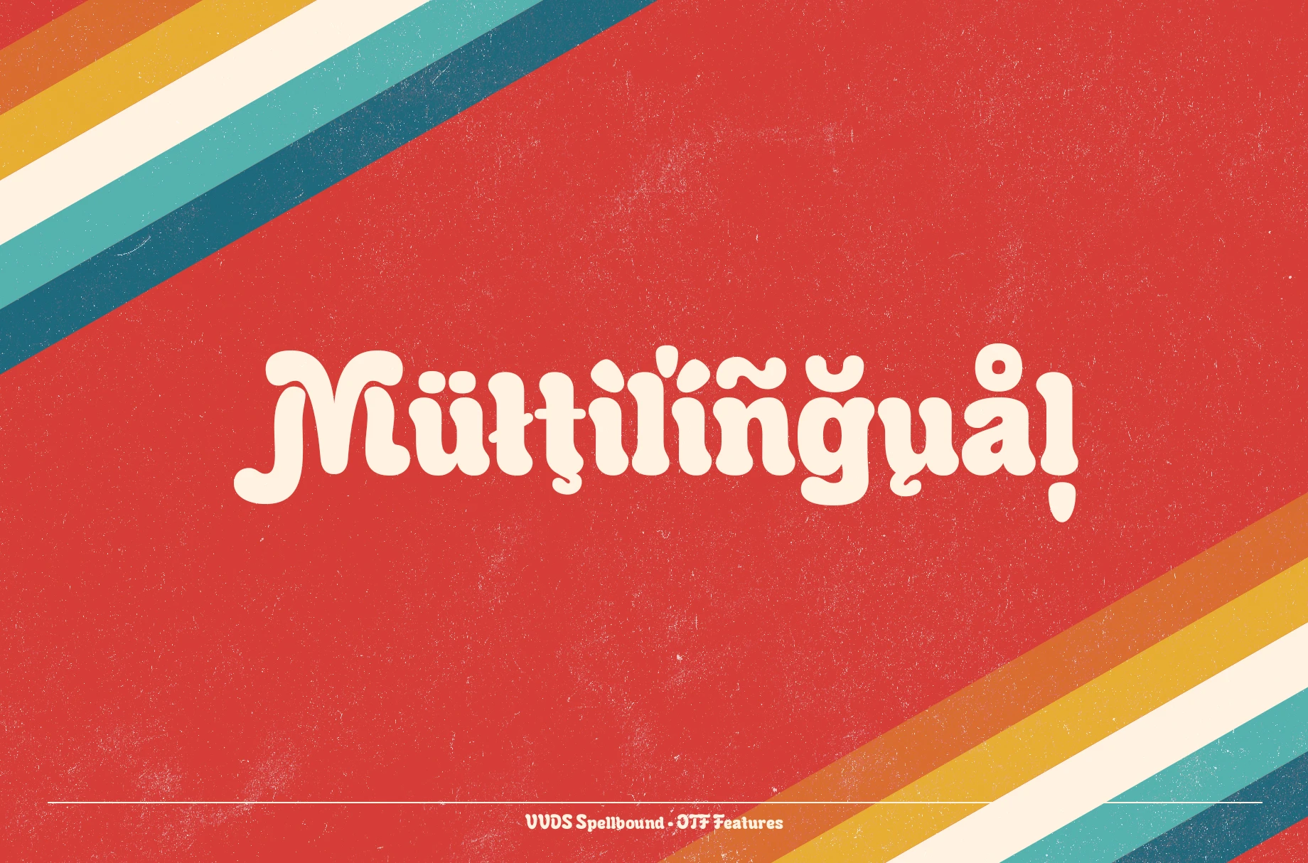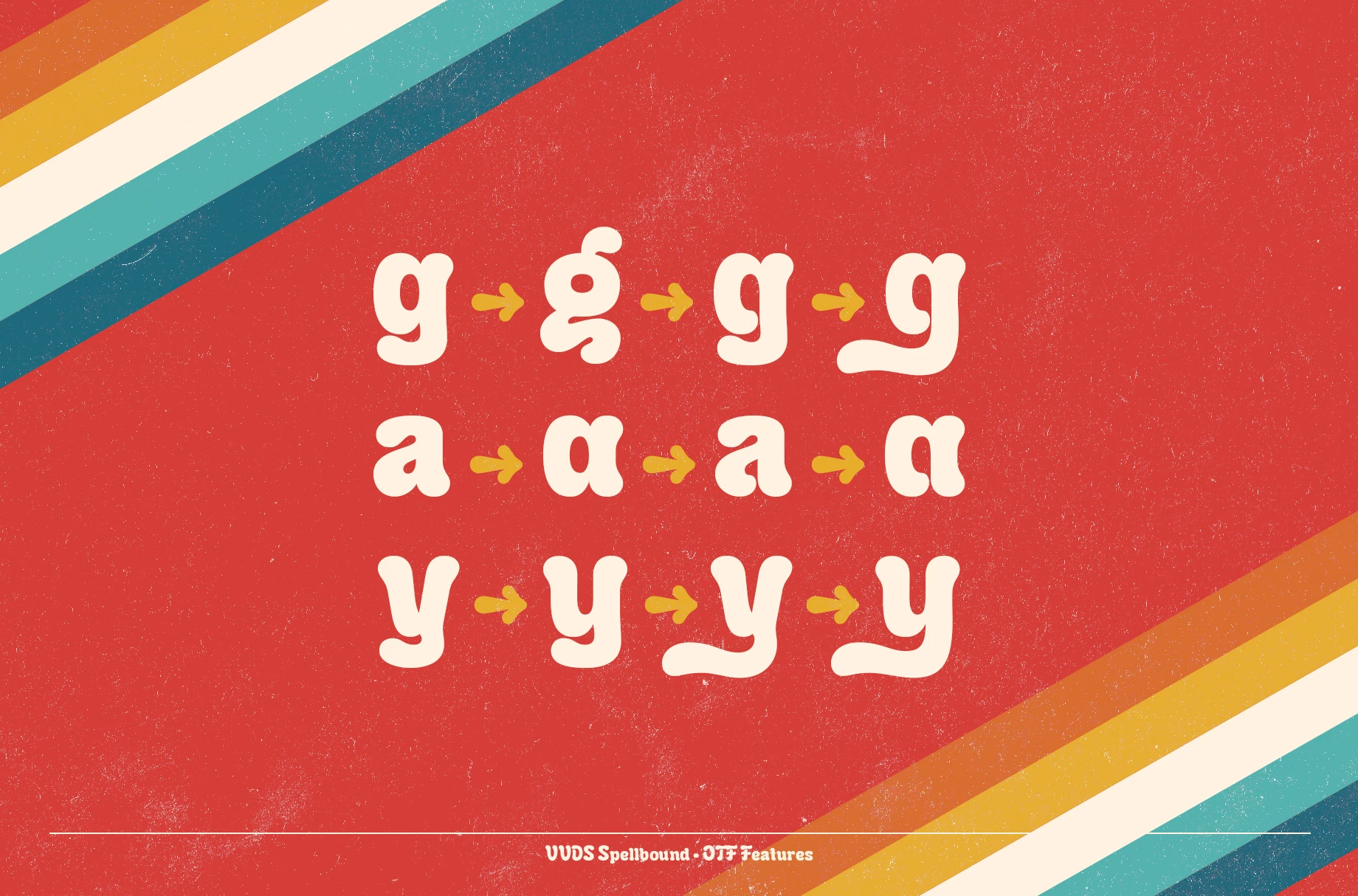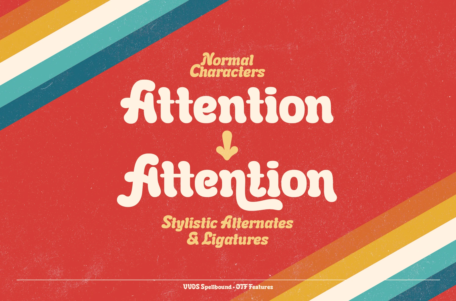 Spellbound is an authentic groovy typeface inspired by the late 70s and early 80s aesthetic. Smooth, playful, and full of retro character, it’s perfect for vintage-themed designs. Works especially well for display block texts like package labels, headers, t-shirt prints, and stickers. Offers a wide range of creative options with multiple alternates — two for each capital letter and up to six for lowercase. Includes both Regular and true Italic styles for dynamic pairings. Built with OpenType features for flexible, expressive typography.