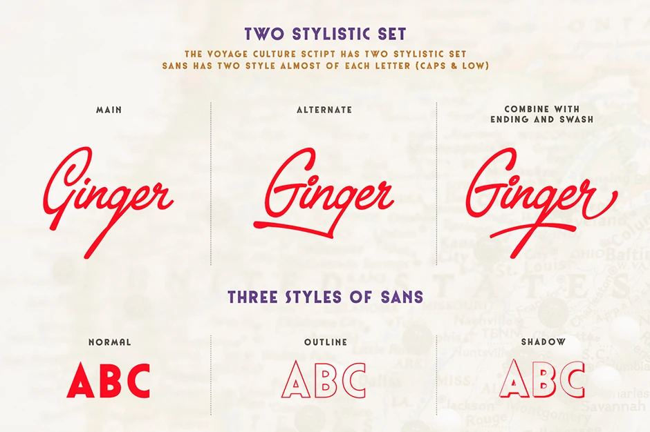 Perfect for t-shirts, café logos, music posters, candy packaging, and more, the fonts work beautifully together to create standout visuals. With distinctive characters in the sans and the expressive brush of the script, Voyage Culture adds charm and character to both modern and vintage-themed projects.