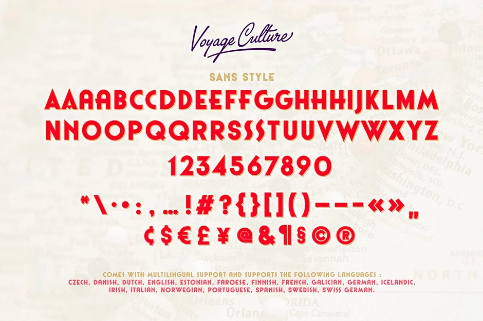 Voyage Culture is a vintage-inspired font pair designed for flexible, stylish typography. It combines a bold, art-deco influenced sans-serif with a playful retro brush script. Inspired by early 20th-century travel posters, this duo brings a nostalgic yet energetic feel to any design.
